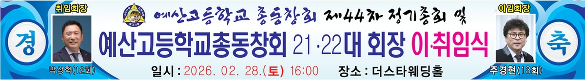 예산고등학교 총동창회 제44차 정기총회 및 제21대, 제22대 총동창회장 이취임식을 아래와 같이 개최하오니 동문여러분의 관심과 참여 부탁드립니다= 아래 =일시 : 2026년 2월 28일(토) 16:00장소 : 더스타웨딩홀(예산읍 벚꽃로 155번길 52-11) / 예산터미널 근처참석대상 : 예산고등학교 전동문/// 이임회장 : 주경현(13회) /// 취임회장 : 박상혁(12회)예산고등학교 총동창회 올림 인쇄 주소
